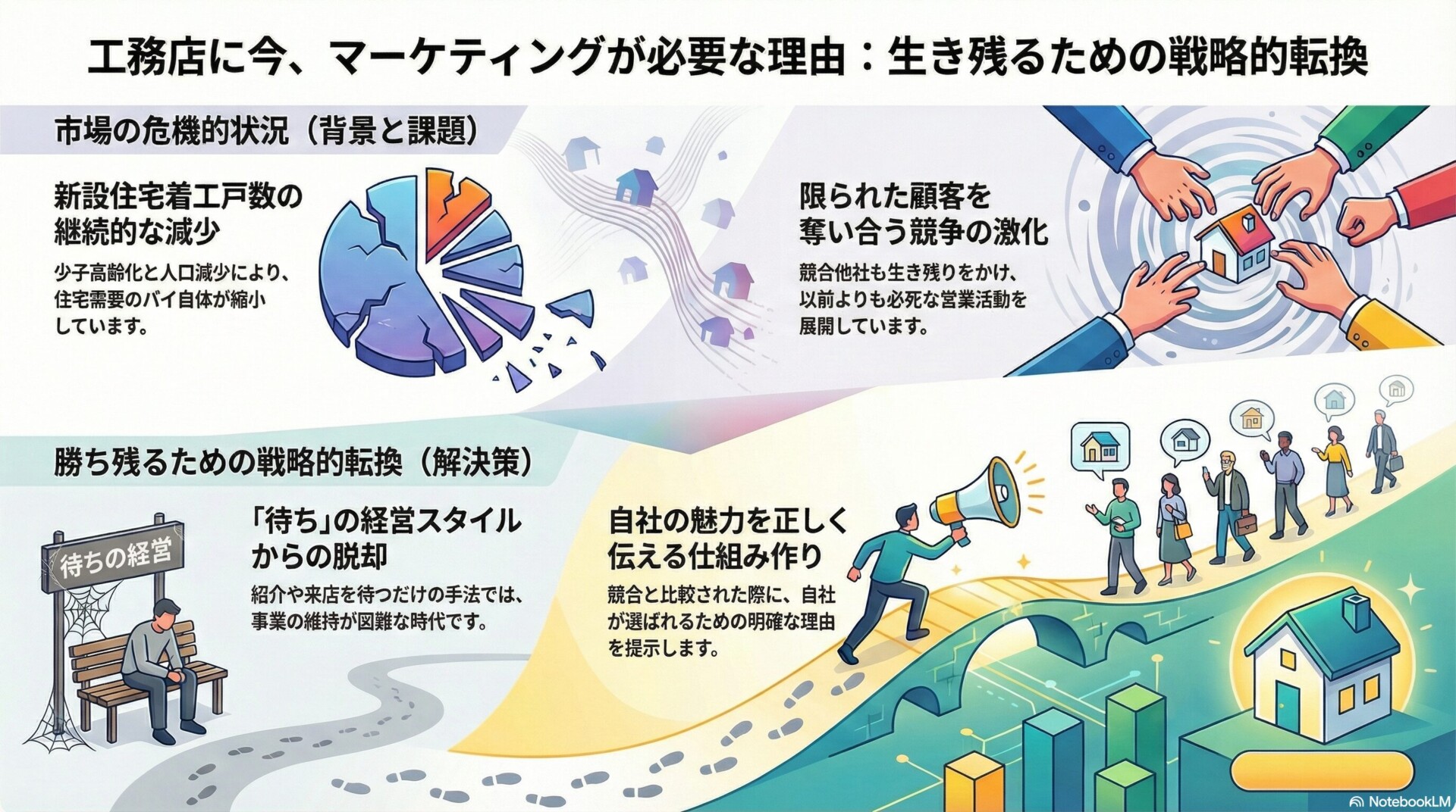 なぜ今、工務店にとってマーケティングがこれほど重要視されているのでしょうか。その背景には、市場環境の大きな変化と、顧客の住まい探しのスタイルが変わったことが挙げられます。これらの変化を理解せずに対策を行っても、期待する効果は得られません。