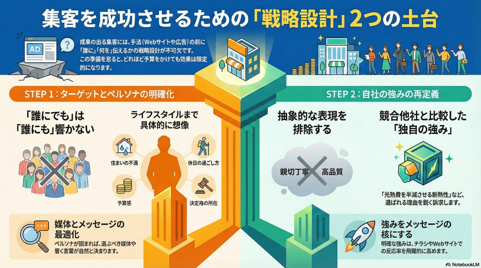いきなりホームページを作ったり広告を出したりする前に、必ず行うべき準備があります。それは「誰に」「何を」伝えるかを明確にする戦略設計です。この土台がしっかりしていないと、どんなに予算をかけても集客効果は限定的になってしまいます。